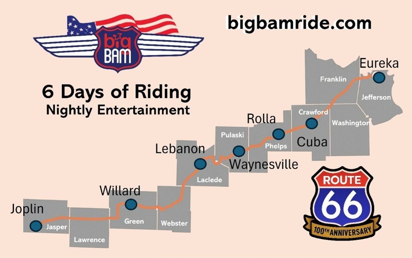 Day's Inn - Single Kings or Double Queens for $75 includes breakfast. Mention you are with Big BAM Route-66 to secure the discount rate. 1 1/2 mile from Camp. Reserve by phone at: 573 885-0100.